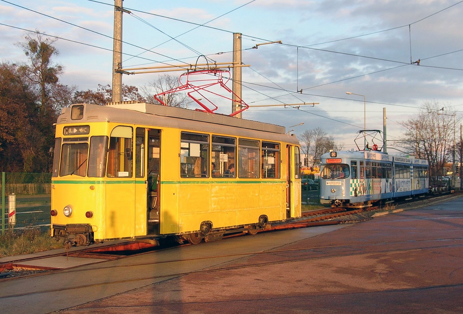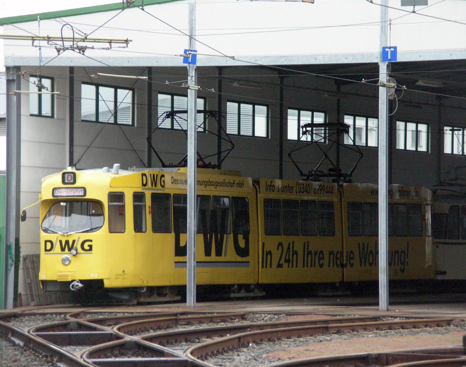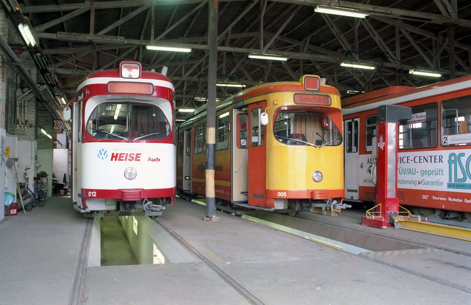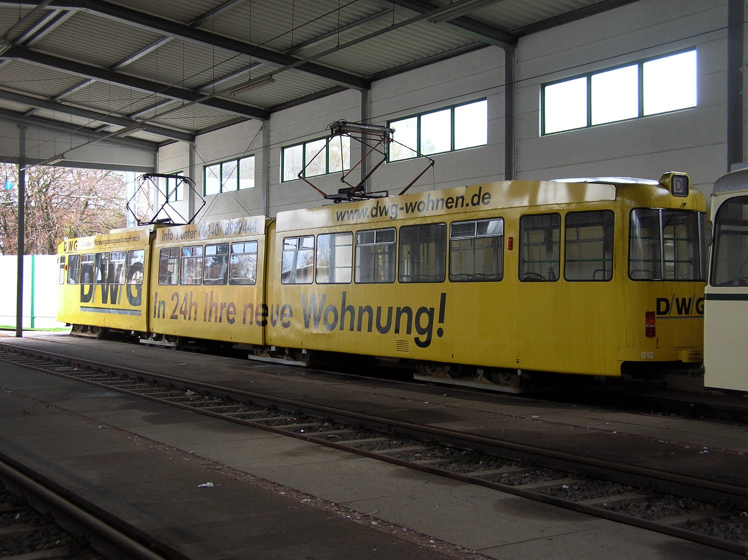 NEU 40 DUEWAG-GT8 012 mit Schmierbügel für den Winterdienst auf dem hinteren Teil Betriebshof 2005 |