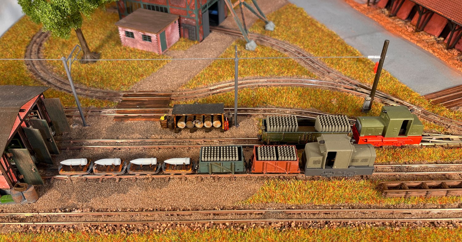 ![]() 29 Zwei Jung ZL 233 an der Dieseltankstelle. Dahinter endet die elektrifizierte Strecke die irgendwann von einem Waldbahn-Modul kommen soll. Dafür stehen zwei SSW-Fahrleitungsloks zur Verfügung. |