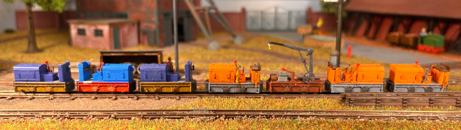 96 BN30 als Lok 17 von KEMAT, mit meinen Prototypen der dreiachsigen Schwerlastlore von KEMAT und einer Arthur-Koppel-Kipplore. |