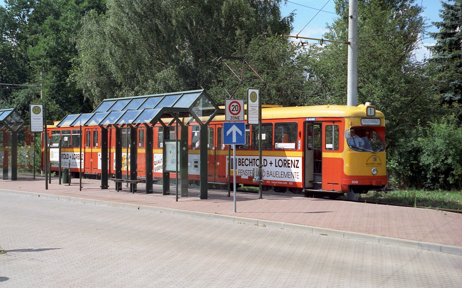 NEU 41 DUEWAG-GT8 012 mit Schmierbügel für den Winterdienst auf dem hinteren Teil Betriebshof 2005 |