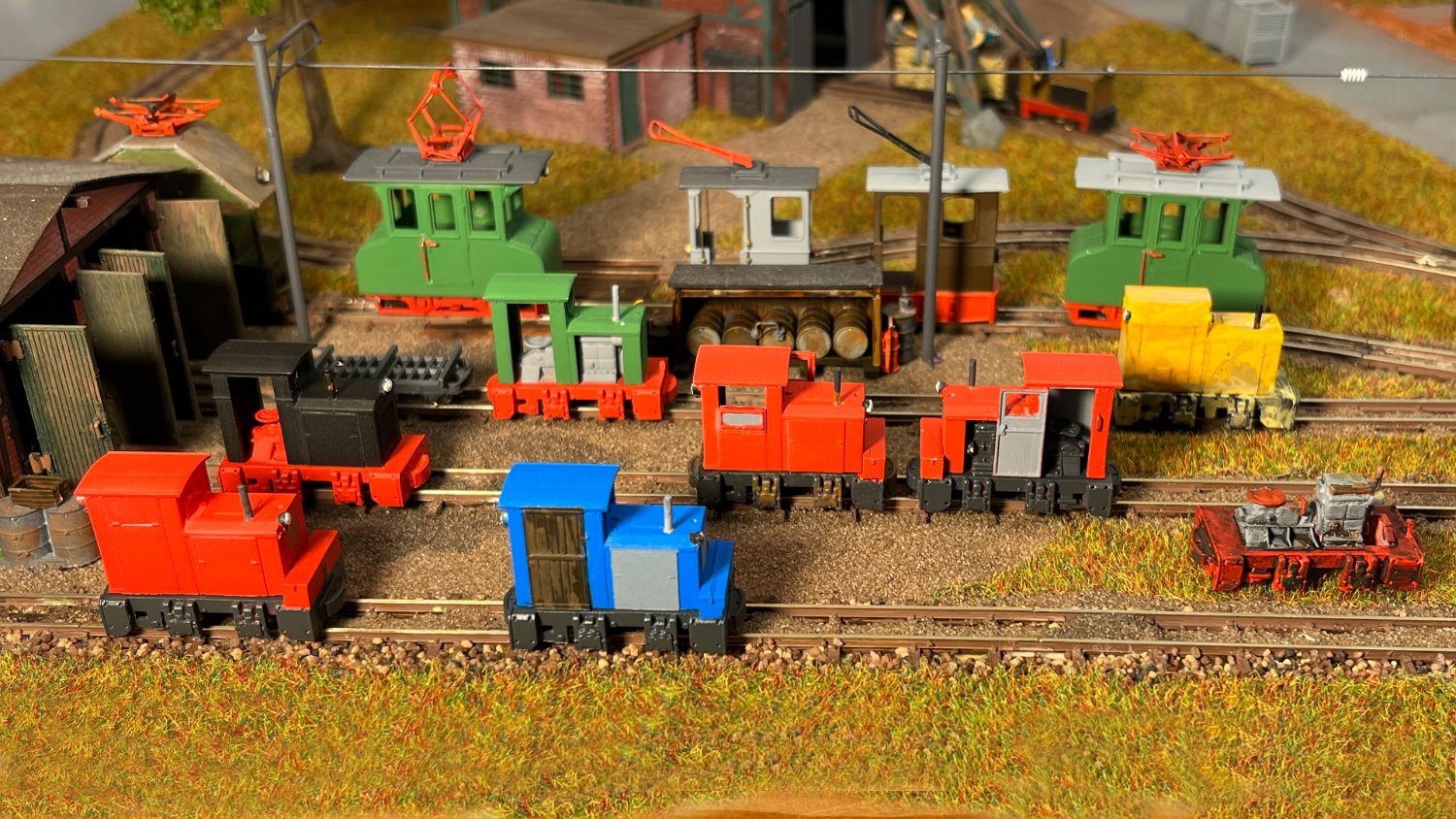 NEU 170 Vorn die kleinsten Akku-Loks in meinem Museum: Links ein Karlik (Bausatz micro_miners) sowie zwei Siemens 1A2, bemerkenswert der Universalfahrlader als Fertigmodell von micro-miners. |