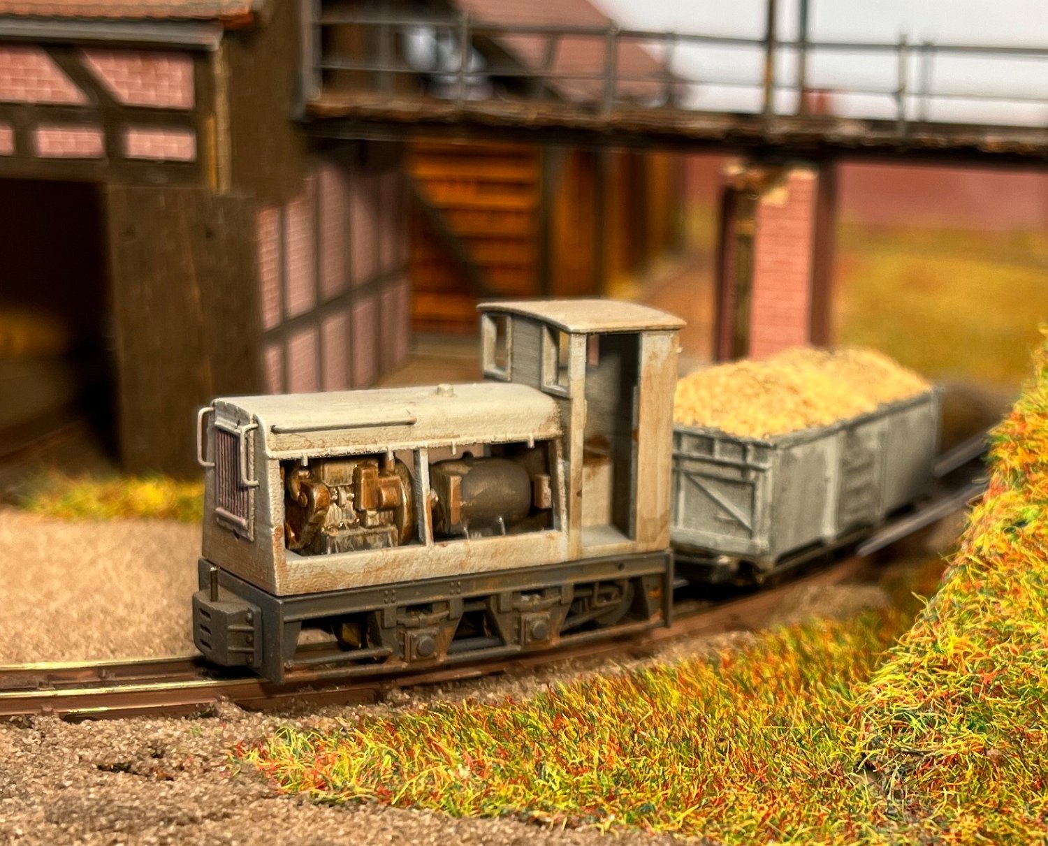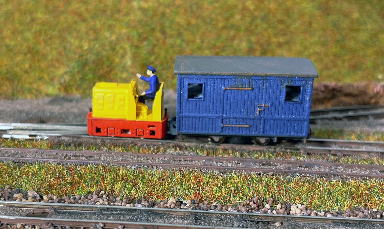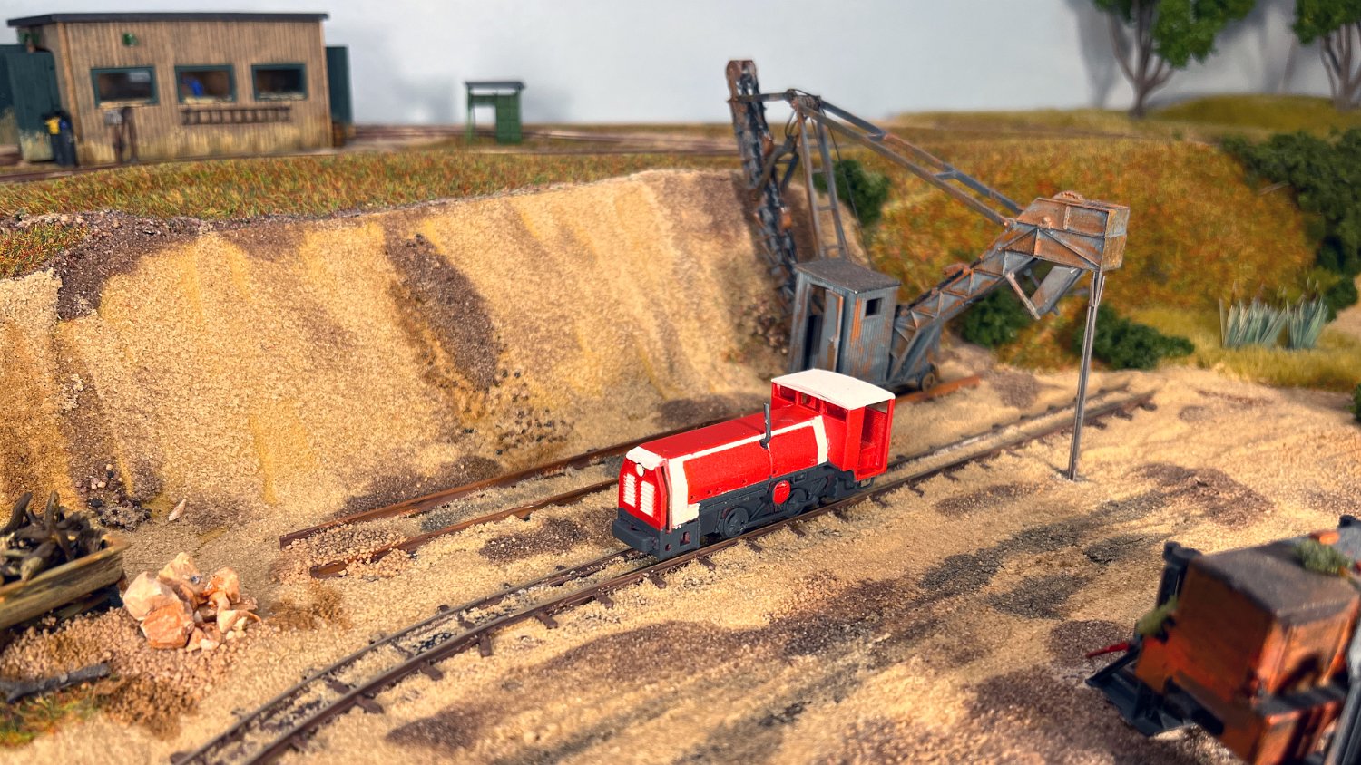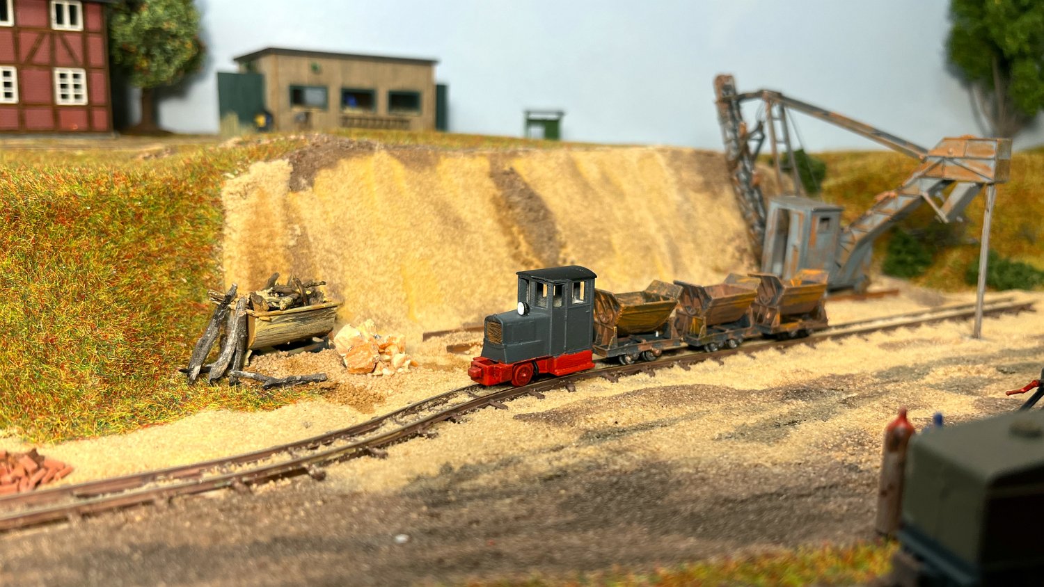 11 Die Lokschuppen ohne Details, der Busch-Bagger steht noch lose und schief, aber es ging gut weiter. Die 20-PS-Simplex ist derzeit mein kleinstes rollfähiges Lok-Modell und wird hier vom Ziegelbruch-Geisterwagen geschoben. |