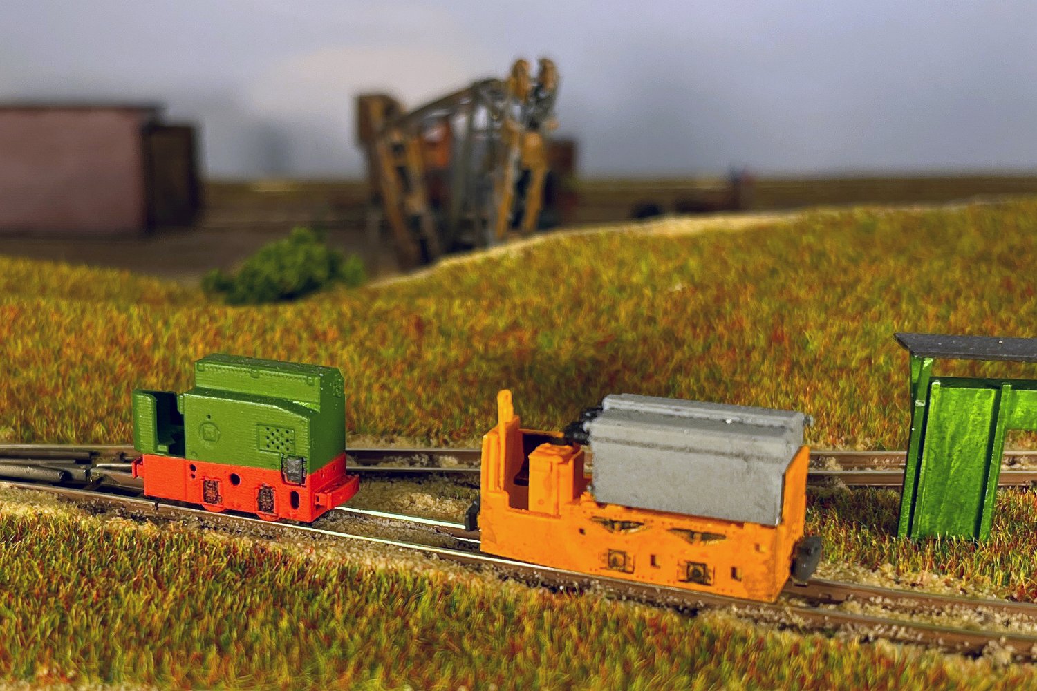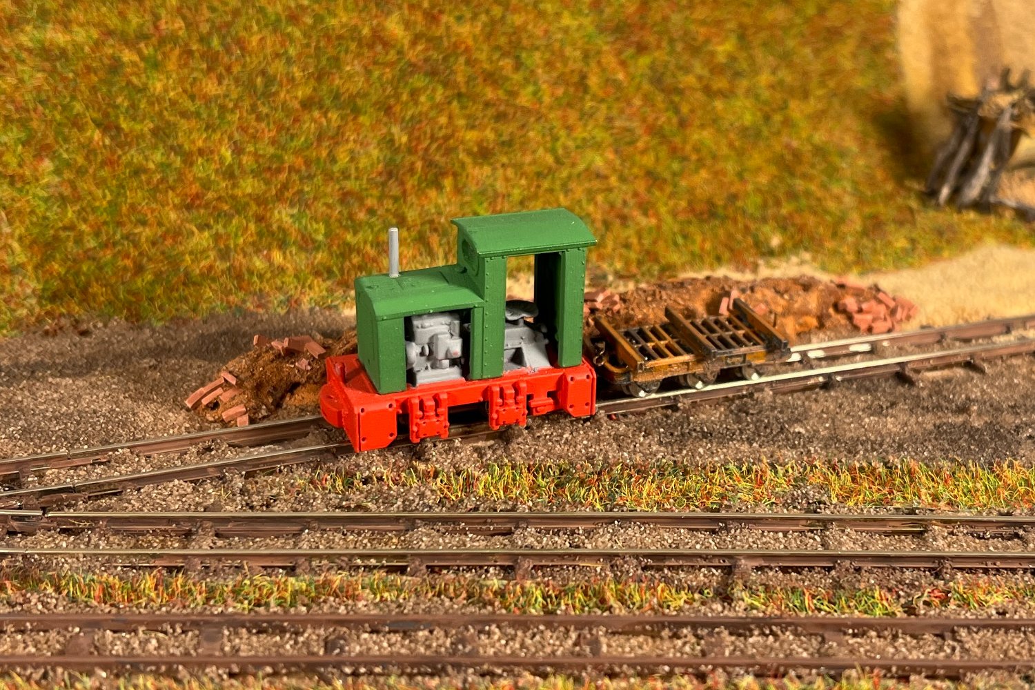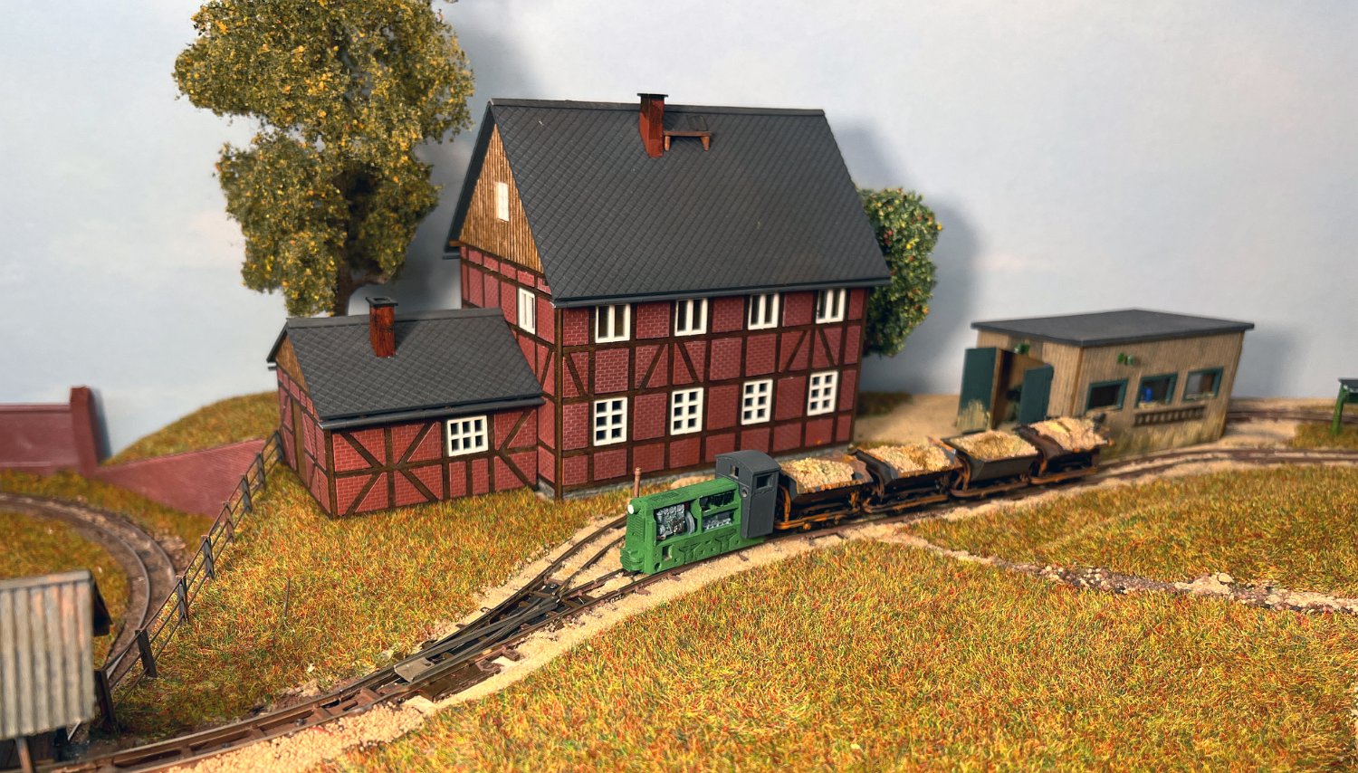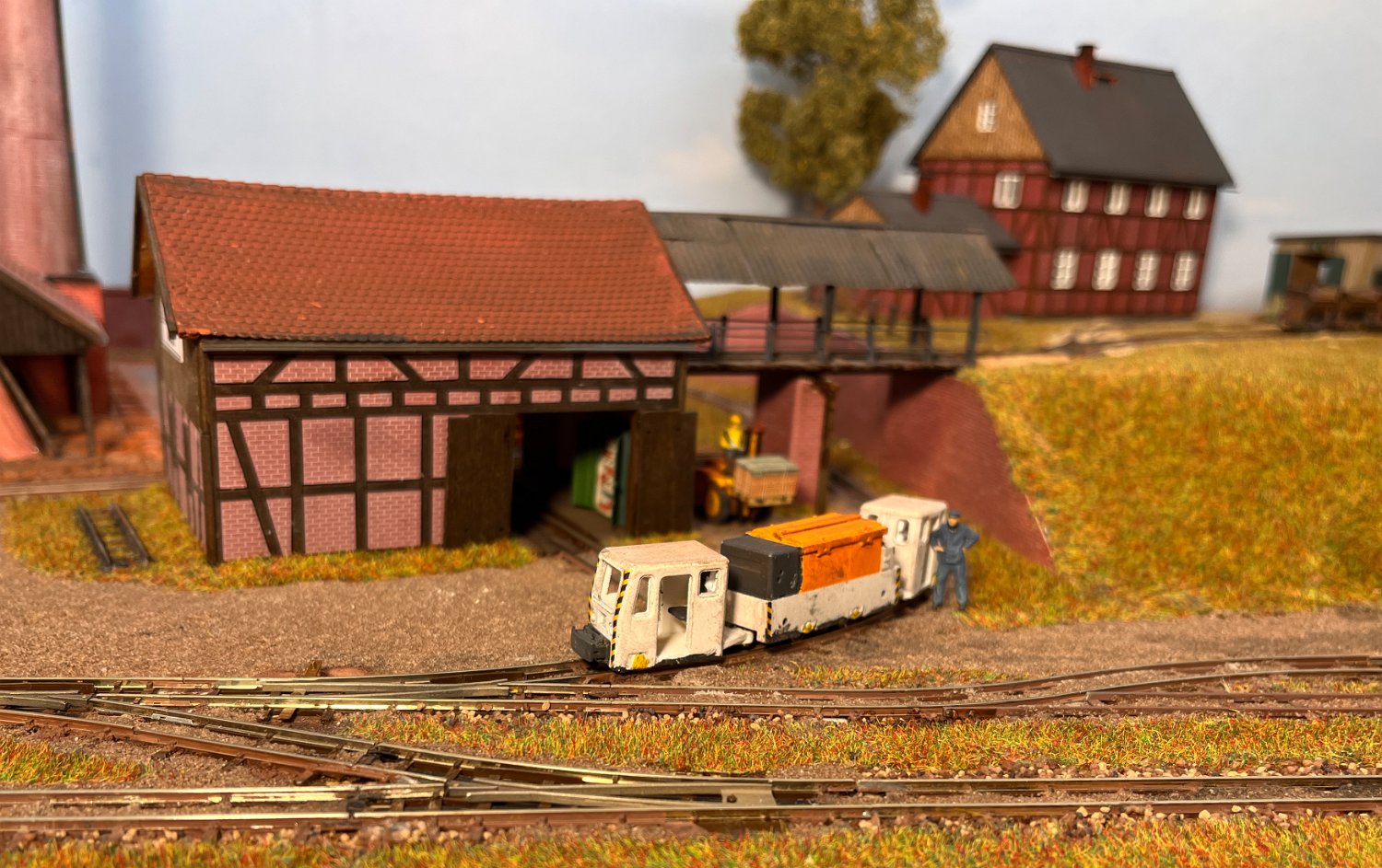 11 Die Lokschuppen ohne Details, der Busch-Bagger steht noch lose und schief, aber es ging gut weiter. Die 20-PS-Simplex ist derzeit mein kleinstes rollfähiges Lok-Modell und wird hier vom Ziegelbruch-Geisterwagen geschoben. |