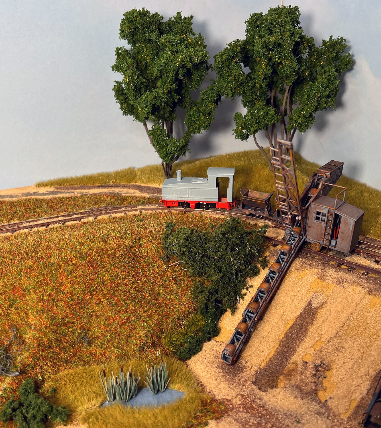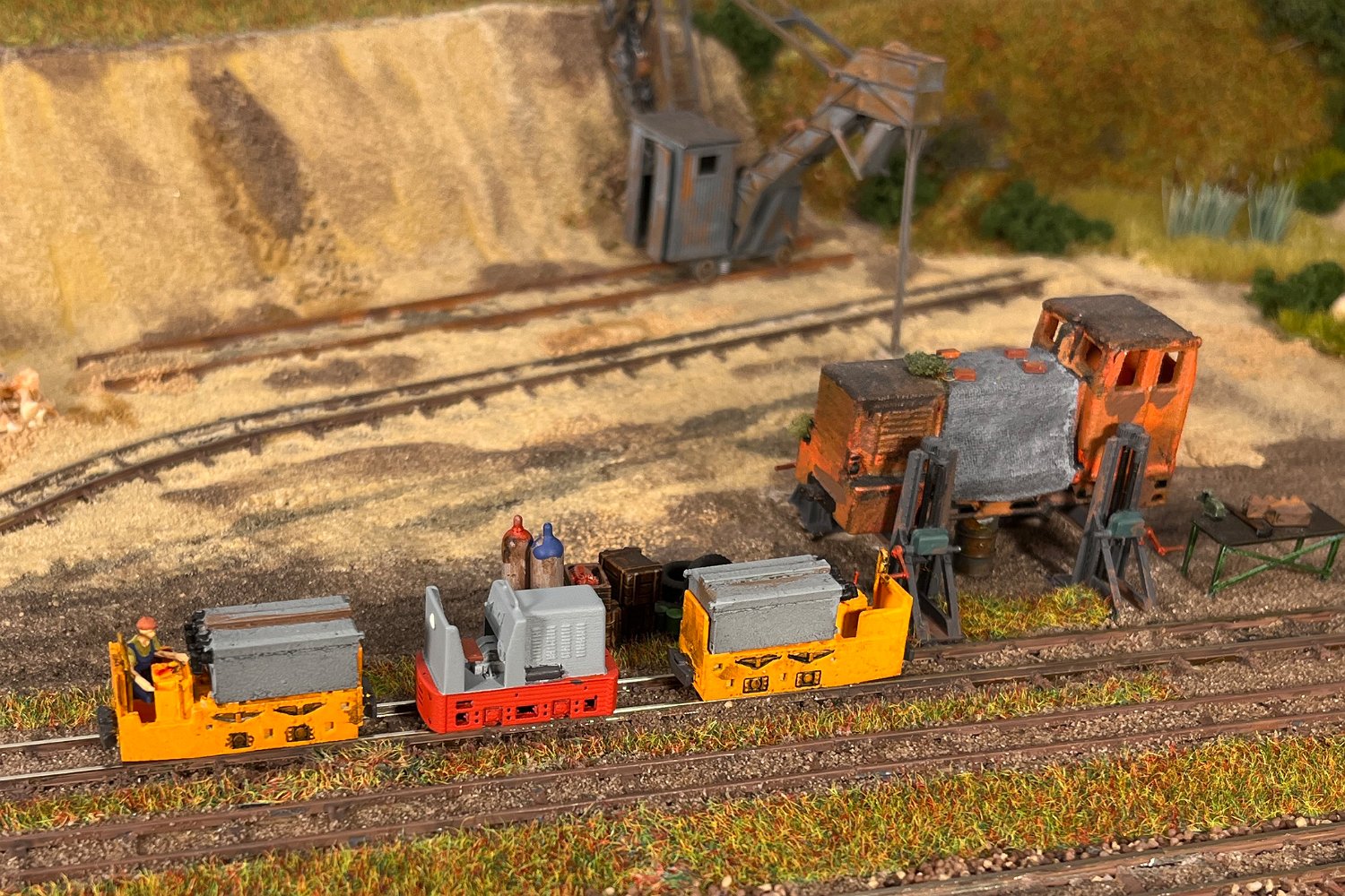 30 Die untere Ebene macht Fortschritte: Auf einer Winde wartet ein V10C auf die Aufarbeitung, am Tümpel wächst Schilf und der zweite Bagger steht endlich mit straffen Seilen richtig eingegleist da. |