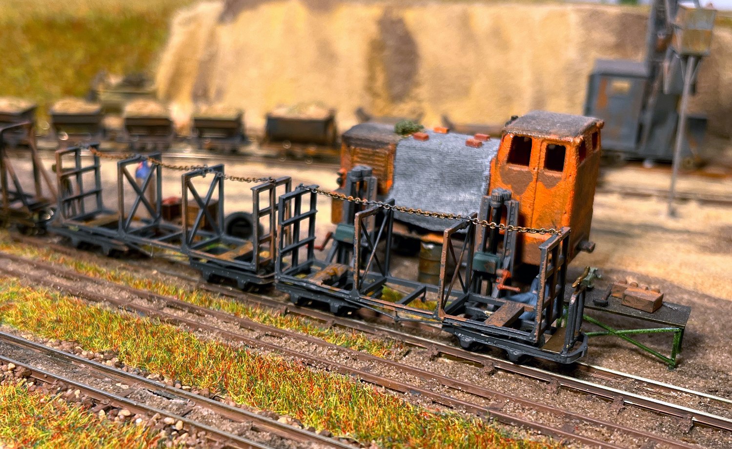 96 BN30 als Lok 17 von KEMAT, mit meinen Prototypen der dreiachsigen Schwerlastlore von KEMAT und einer Arthur-Koppel-Kipplore. |