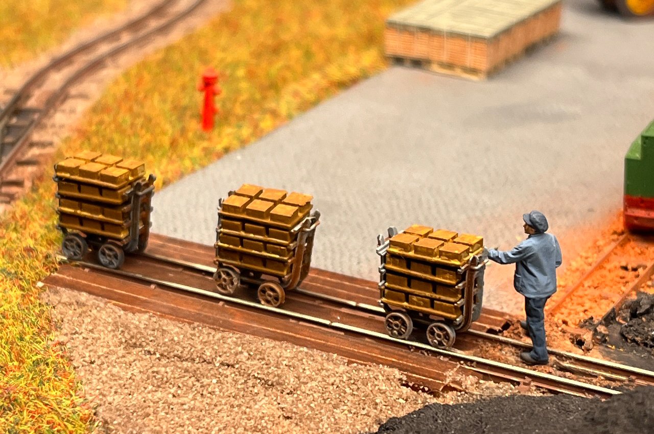 64 Drei der Förderwagen, die aus einer amerikanischen Kupfermine in mein Museum kamen. Die H0f-Modelle bestehen aus mehreren Einzelteilen und können geschwenkt oder mit geöffneter Klappe montiert werden. |