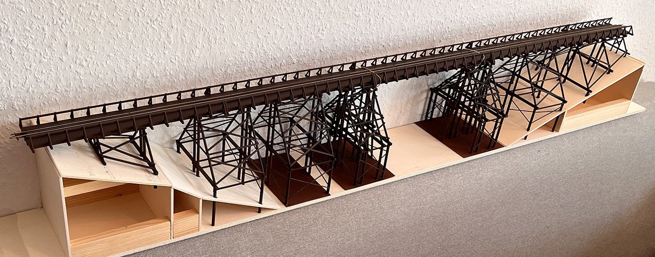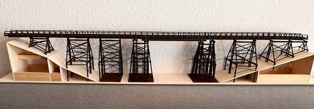 NEU 178 Nach einer Musterzeichnung der Deutschen Eisenbahnpioniere um 1900 entstand die Feldbahnbrücke. Mit 7 Stützen und 8 Fahrbahnteilen ist sie 1035 mm lang. |