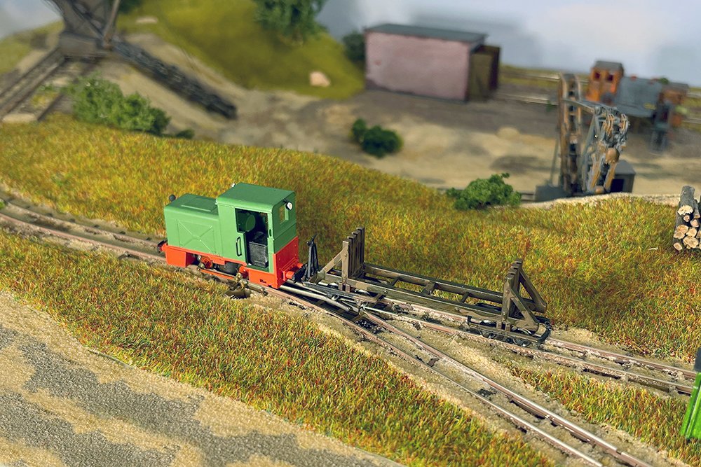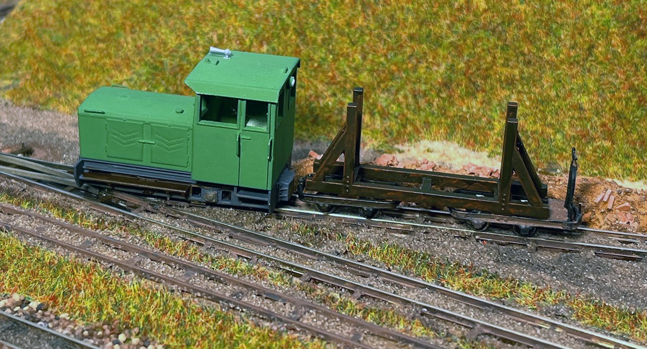 18 Die Kent Construction Company baute auf Basis der Simplex-40-PS-Lok das Vorbild für dieses Modell, das mit dem angehängten Kies-Geisterwagen fahrfähig ist. |